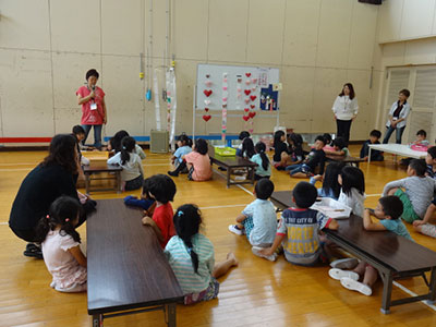 第一部はてんたん人形劇場さんによる人形劇上演とおもちゃ広場です。てんたんさんの歌とギターの音色、楽しい人形劇場にひきこまれました。また、ぬくもりのあるたくさんの木のおもちゃに夢中になり、みんな笑顔に。第二部は太白区家庭健康課保健師さんによる身長体重測定と手形カード作りコーナー、おさがり市です。地域の皆様から提供していただいた夏服やくつ、浴衣等にお気に入りもたくさん!参加した親子さんに大変喜んでいただきました。コーナー終了後はお弁当を食べながらゆっくり過ごす姿も多く見られました。100名以上の乳幼児親子さんが集い、大盛況のおまつりとなりました。ご協力いただきました皆様、本当にありがとうございました。