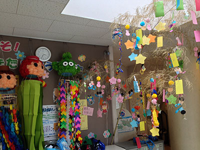 2015/07/04たくさんの小学生と幼児親子さんの参加で七郷児童館の七夕飾りが出来上がりました。貝つなぎ、吹き流し、くす玉、輪つなぎ、織り姫、ひこ星、そしてみんなの願いの詰まった短冊が飾られました。好きな飾りつくりから始まって、ほとんどのお友達が全部の飾りを作りました。最後におみやげに家で飾る笹をもらい、好きな飾りをつけて帰りました。