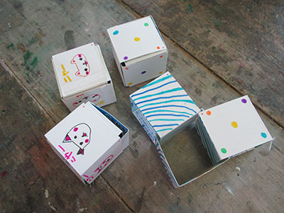 5月の小学生対象行事として、牛乳パックを利用し12個の面に6面ずつ2種類の絵を描き、絵柄を回しながら同じ絵を6面揃えるパズルを作りました。23名が参加し「どんな絵にしようかな?」「文字でも良いの?」と完成を想像し、色や柄を工夫して、絵を描きました。パズルの6面全てを揃えるのが難しい子もいましたが、やっと出来た時には「やったぁ!そろったぁ!」と嬉しそうに見せ合っていました。最後にそれぞれの工夫したポイントを発表しあいました。友だちのアイディアに刺激を受けて絵を描き足す子もいました。オリジナルのBOXパズルが完成し、満足感いっぱいの子供たちでした。