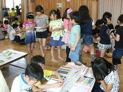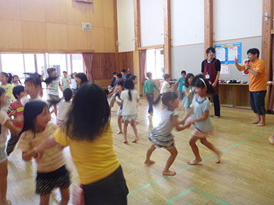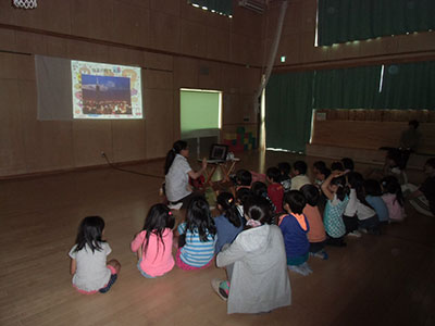 宮城学院女子大学の留学生さんが来てくれました。台湾の食べ物や観光地などがスクリーンに映るたびに、「わぁー!」「すごーい!」と子どもたちから歓声があがりました。台湾について学んだ後は、館庭で台湾の遊び、「フォンリューダン」=「信号」、「ダーフォンチェイ」=「風が吹く」を一緒に楽しみました。中国語を使っての鬼ごっことイス取りゲームで、異国の文化を全身で感じることができたようです。参加した子どもたちからは、「台湾に行ってみたくなりました」、「面白いからこれからも台湾の遊びをやりたい」などの感想が聞かれ、異文化への興味をもつひとつのきっかけになったようです。