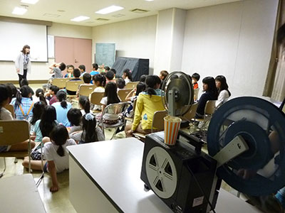 四郎丸小振替休業日に行った映画会。今ではとっても珍しくなった16ミリ映写機での上映でした。ポップコーンの香ばしい香りとともに「ジー・・・」というなんだかほっとする音。『おばけ長屋』『ともだちや』『吉四六どん』の3本を見ました。子どもたちは心もおなかも満たされて、とても満足気でした。フィルムを巻き戻す間、職員によるクイズや妖怪ウォッチの手遊びもあり、児童館ならではの本当に「わくわくドキドキ」な映画会でした。