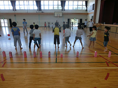 運動会の振替休業日に広い小学校の体育館で「ピンドッジ」で遊びました。2チームに分かれてボールを投げたり転がしたりして、大小のピン(牛乳パックで作ったもの)を沢山倒した方が勝ち、というゲームです。小学生チームと職員チームの対戦では、小学生チームが勝利をおさめました。子どもたちは、広い体育館で思い切り遊ぶ事ができた時間でした。児童館の遊戯室でも額に頭に汗して遊んでいます。