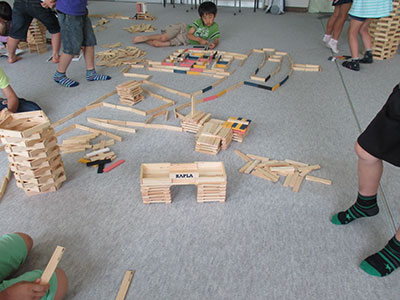 小学校の振替休業日に『魔法の積み木カプラ』で遊びました。2年生以上の子供たちは、何回か遊んでいた子がいたので、「あの時こうだったから今回はこうしたい」と目的をもって作っていうました。はじめてカプラをする1年生は、最初に作ってあった見本をヒントに「こうしたら崩れにくいかもしれない」と工夫しながら作っていました。そうやって、1人でコツコツ高い塔を積み上げる子もいれば、友達同士で大きな街を作ったり、1つ作っては崩してその音を楽しんだり、かわいい形をいくつも作ってみたりと、みんな思い思いに楽しんでいました。