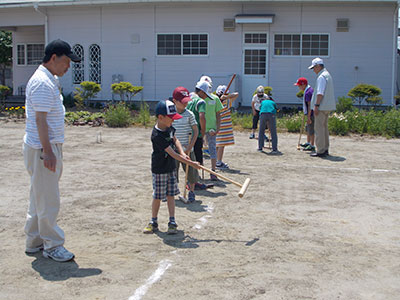 小学校の振替休業日の恒例となりました、春秋会さんとゲートボール。青空の下、ゲートボールコートをお借りして、春秋会さんにステイックの持ち方や、ボールの打ち方など丁寧に教えていただきました。