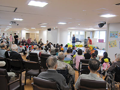 2015/05/14社会福祉法人愛泉会望岳荘の交流ホールで行われた「そらとぶクレヨンコンサート」。 ふれあい遊びやあそびうたを通して親子のふれあいや地域の方、高齢者の方との交流を図る目的で、加茂市民センター、虹の丘児童センターと共催した事業。 当日は文字通りの五月晴れで七北田川を渡る風が心地よく、泉ヶ岳の眺望も快い。