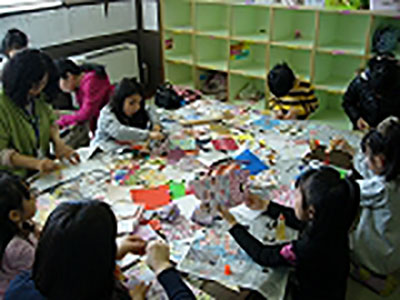 ちょっと早めのこいのぼり作りをしました。色とりどり模様も様々な紙をそれぞれ自由に貼って、この世に一つだけのこいのぼりたちが出来上がりました。4月の末には、他の児童館からもおともだちが作ったこいのぼりが集まって、若林文化センターにて大きなアートに変身します。