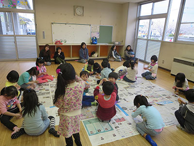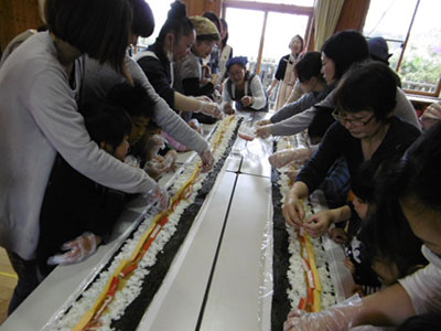 ⇒心地よい風と満開の桃色の花びらが季節を感じさせる中、子育て支援クラブメイメイさんによる「お花見パーティー」が行われました。パーティーのメインディッシュはなんと「ジャンボのり巻き!」長机2台分、長さ3m以上のジャンボのり巻きを「せーの!」の掛け声と共に、31名の乳幼児さん親子が一気に巻いて完成させました。卵、ほうれん草、カニカマ、かんぴょう・・・と様々な具材が入った美味しいのり巻きに参加者全員が大満足でした。「いただきます。」の挨拶の後はメイメイさんによる手遊びや歌遊び、ギターの生演奏も行われ、五感の全てで季節を感じることが出来る素晴らしい時間に、笑顔が輝くパーティーとなりました。
