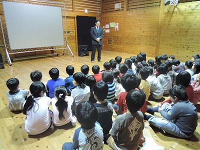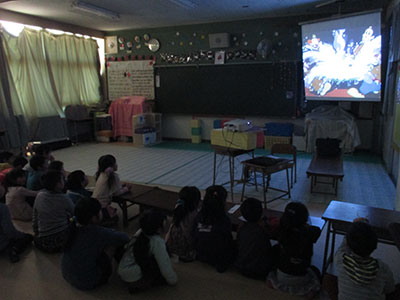 新1年生にとっては初めての児童館行事。何を見るのかドキドキしながらこの日を迎えました。更に、今回県民共済の協力を得て3D映画を上映することを知ると、子ども達の期待もさらに高まっていきました。3D映画の専用メガネを渡され、みんなドキドキワクワク。そしていよいよ3D映画開始!映画は①交通安全②動物園の裏側③恐竜博物館の3つを見ました。子どもに人気だったのはやはり恐竜!!恐竜の大きな口が目の前に迫ってくる時はとても迫力があり、大人は思わず体を引いてしまうのに反し、子ども達はというと目の前の恐竜を触ろうと一生懸命手を伸ばしていました(笑)帰る時はみんな笑顔。スリル満点、大迫力の映画会になりました。