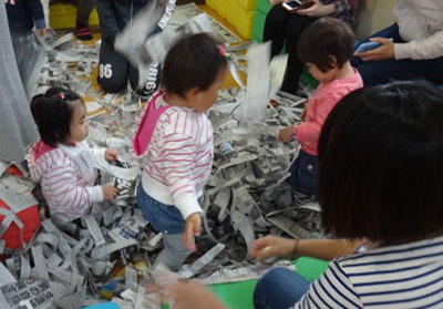 「さんぽ」がなないろぱーくスタートの合図です。音楽が流れてくると、親子で手をつないで遊戯室を歩き出します。みんなで歩くととっても楽しい気分になります。そしていつもの「はとぽっぽ体操」です。回を重ねる毎に一緒に踊れる幼児さんが増えてきました。その成長ぶりをみるのも楽しみの一つです。そして、絵本「おでこぴたっ」を読みながらママと「おでこぴたっ」のふれあい遊び。最後に新聞紙をびりびりと細く手で裂いて、新聞紙プールを作りました。新聞紙をびりびりするのもとっても楽しそうでしたが、新聞紙プールが出来上がると大興奮。下から新聞紙をすくって頭の上からバサアーッと。もう楽しくてたまらないって感じでした。