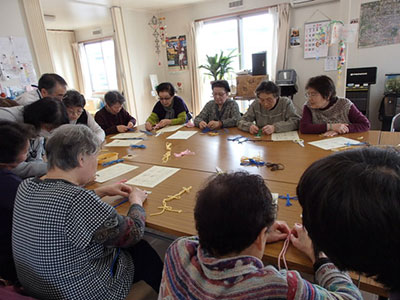 2015/03/19遊戯室に座卓を並べ、コラージュの技法でちょっとはやめのこいのぼりを作りました。コラージュとは、折り紙や包装紙などを何枚も組み合わせ、台紙のこいのぼりに貼っていくという技法です。数えきれない程のこいのぼりの素材を見て、子どもたちの目がキラキラ輝いていました。好きなキャラクターの折り紙を選ぶ男の子もいれば、和風で渋い柄を選ぶ女の子も!まるで振り袖を着たこいのぼりのようでした!紙をはさみで切ったりちぎったりして組み合わせる子どもたちの顔は真剣そのもの。色や形にこる子どもは行事が終了しても、別室で頑張って完成させました!色とりどりの、自分だけのこいのぼりを作ることが出来て大満足な様子でした♪