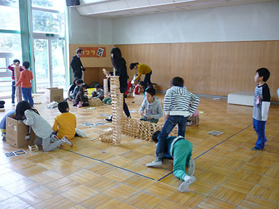 台原小学校の授業参観日に移動児童館を行いました。授業参観後の保護者懇談会に合わせ、ホールを使ってコーナー遊びを楽しみました。東北福祉大学ボランティアサークルの学生さんのお手伝いをいただき、マンカラ・紙相撲・輪投げ・カプラで遊びました。特にカプラは初めての体験で、開会直後行ったナイヤガラの滝にはホールいっぱいの歓声が上がり、その後、目を輝かせながらチャレンジする姿がとても印象に残りました。