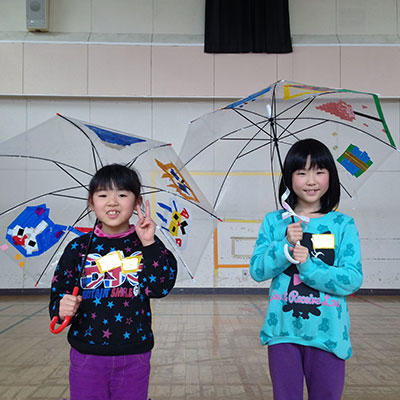 大学生のお兄さんやお姉さんが、熱心に教えてくれたので、全員、自分だけの「オリジナル傘」が時間内にできあがりました。完成した傘をうれしそうに開いて、お互いに見せ合っていました。