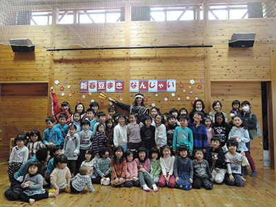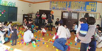 ホールの真ん中にドーンと設置された長いトンネルや節分にちなんだ鬼退治コーナー等で遊んで創作意欲が湧いたら、レッツ工作☆難しいところはボランティアの学生さんたちがお手伝いしてくれて、見事完成!
