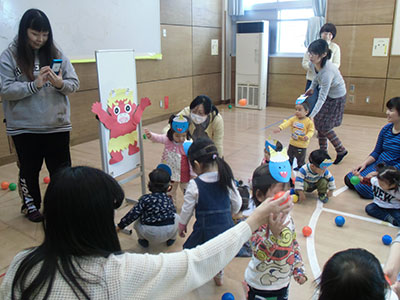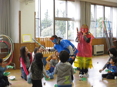 その後、お面をかぶった子どもたちがみんなで協力し、豆に見立てたボールを投げて見事おにを退治しました!