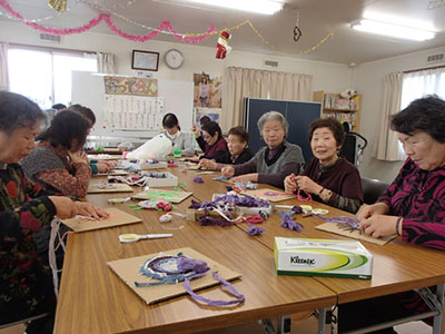 1月は、さき織りのなべ敷きを作りました。ダンボールで作った簡単な織り機に細かくさいた古布を編み込んで作りました。色の組み合わせを考えながら好きな布を選び、芯になる糸にどんどん通していき完成します。作っている時は皆さん無言で、集中している感じでした。「なべ敷きにしよう」「壁飾りにしよう」とでき上がった作品を喜んでいました。