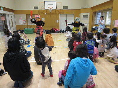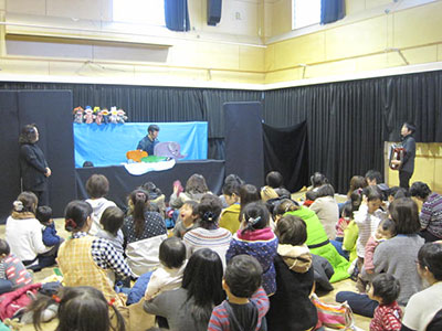 「劇団21」のみなさんによる人形劇が児童館にやってきました。小雨の降る中たくさんの幼児親子が集まり、会場は満員御礼。音楽に合わせてたくさんのお人形が登場すると、「お母さん、見て見て!」と指を差して喜ぶ幼児さん。さらには腹話術のお人形が上手におしゃべりする様子を不思議そうにじっと見つめていました。人形劇の最後には虹色に輝くシャボン玉がふわふわと飛び出し、素敵な仕掛けに子ども達もママも驚きの表情をうかべていました。カッパのボードビルや腹話術、アコーディオンの伴奏に合唱、手袋人形、ペープサートと盛りだくさんの内容で45分間の公演があっという間に感じられました。