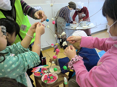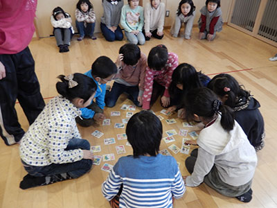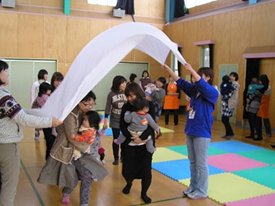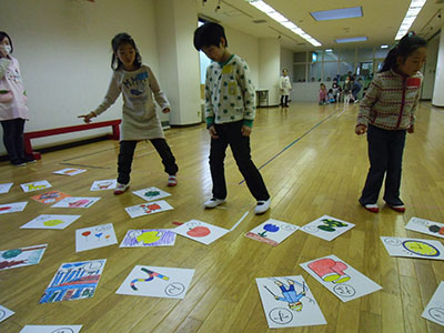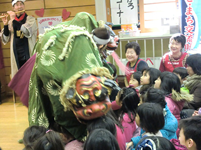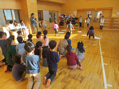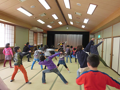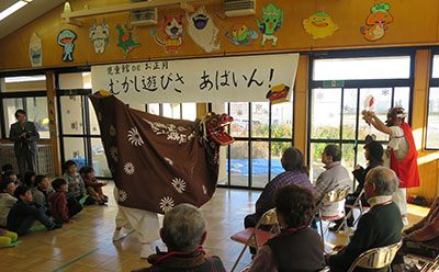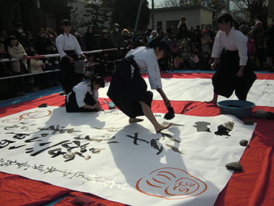 2015/01/101月10日に行われた児童館祭のオープニングを飾ってくれたのは、ウルスラ学院英智高等学校の書道部の皆さんによる書道パフォーマンス!“すずめ踊り”の軽快な笛の音に乗せ、書道部の皆さんによる口上が始まると、袴姿の女子高生たちが5×3メートルの巨大な白紙の上を箒のようなふと筆を持ち、所狭しと駆け回ります。勇ましい掛け声とともに完成したのは“未来への希望”と“遊ぶ門には福来る”の2作品。館祭に来場した多くの皆さんの拍手と高校生のエネルギーが凝縮された書は、若林区中央児童館の開館20周年を祝うにふさわしいものとなりました。