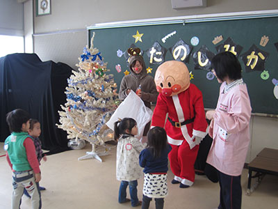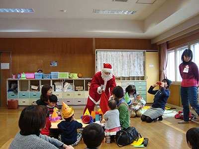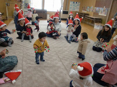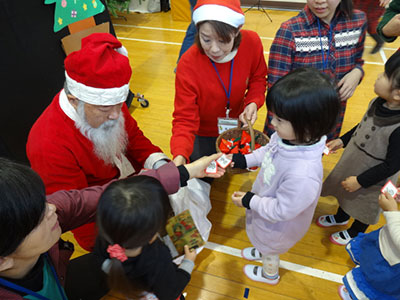みんなで「あわてんぼうのサンタクロース」の歌に合わせて鈴を鳴らしたり、パネルシアターを見たり、ミニケーキを食べたり……楽しいひとときです。最後に何とサンタさんが登場!ちょっぴり驚いて泣いてしまったお友達もいましたが、プレゼントをもらってにこにこ。楽しいクリスマス会でした。