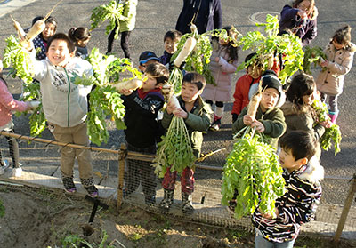 児童館の畑で育てた冬の野菜の収穫をしました。今回は大根!!葉と根の付け根を掴み引っ張ってみる…「ポキッ…」あぁ~あ、途中で折れちゃった。何回か収穫するうちに「スッポッ!!」50㎝ほどの大根が現れました。スーパーの店頭に並んでもおかしくないものから、これは巨人の手か?○○星人か?と思うものまで50本ほどの大豊作でした。収穫した大根は次の日に児童館産お味噌と共にふろふき大根パーティでお腹の中に!!「家では普段食べないですよ。」とお迎えの保護者の中にはびっくりしている方もいました。みんなで収穫し食べる…そんな魔法がかかり食べられたのかな…また来年もいっぱい収穫できるといいですね。