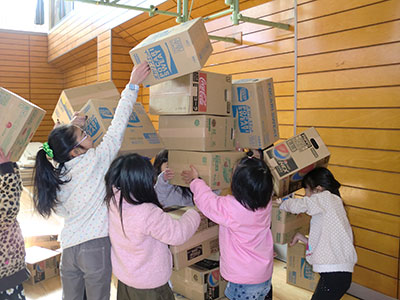 振替休業日の今日、学校の体育館をお借りして運動会を行いました。12月に入ってから日替わりで運動会に向けて練習をし、5種目に挑戦!!大なわとび・むかで・リバーシ・お玉で運ぼ!・段ボール積み。寒さもありはじめはノリが悪かった子どもたちも準備体操からグループ分けをする頃には体も気持ちも暖りテンション全開モードに突入!お玉でのリレーではボールを落とさないよう真剣な目で遠く離れた友だちまで頑張って運んでいました。最後のダンボール積みは、グループで知恵を出し合い、崩れてもまたやり直しながら制限時間内に2m近くまで高く積み上げ大歓声が!!たっぷり2時間楽しく遊びました。
