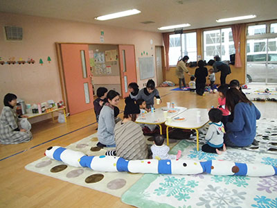 はぴはぴデーは0・1歳児対象の親子遊び、お友だち作りの場です。今月は「心も体もぽっかぽか」と題して行いました。