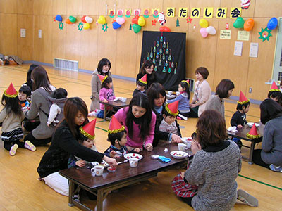 今年度から始まった登録制の幼児クラブ「プチたまクラブ」。お楽しみ会では『てぶくろ』の劇あそびをしました。初めて劇あそびを経験した子どもたちばかりでしたが、セリフを言ったり動物になりきって動いたりと、とってもかわいい姿を見せてくれました。その後はアンパンマンサンタやトナカイの登場にみんなびっくり!手作りおもちゃのプレゼントに子ども達の笑顔がはじけました。ママと一緒のティータイムにはいちごのキャンドルケーキが出され、終始和やかな雰囲気の中ママたちもおしゃべりに花が咲きました。この日は雪のちらつく寒い一日でしたが、プチたまクラブの笑顔と元気パワーがあふれる、温かい時間をみんなで過ごしました。