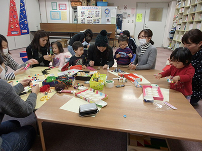 乳幼児親子を対象に、月2回、気軽に楽しめる行事です。今回は椅子の脚カバーを使って、針と糸を使わない指人形を作りました。ふわふわの感触の材料を飾り付けして、出来上がった人形を思いおもいに動かして遊びました。中野栄児童館に来館した、乳幼児親子さんにも参加してもらっています。どなたでもどうぞ!おまちしています。