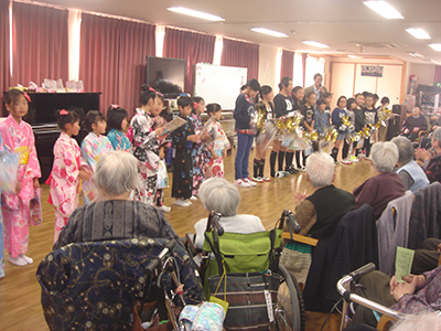 蒲町児童館 日本舞踊クラブ「こもれびの会」、ダンスクラブ「RAINBOW★Flowers」のメンバーが、老人介護施設ツクイを訪問しました。かわいらしい日舞と、リズミカルなダンスの披露に、利用者の皆さんに大変喜んで頂けました。自己紹介をしたり一緒に歌を歌ったり、子ども達にとっても貴重な体験となりました。
