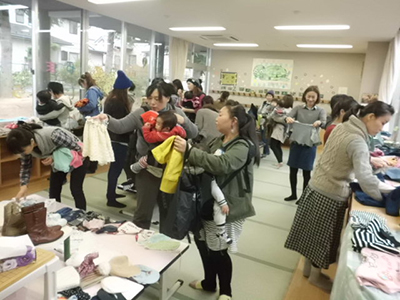 毎週火曜日にたくさんの参加をいただいている「木蓮のわ」の中でも、春秋の年2回シリーズで大好評なのが「おさがり市」です。今回も地域の方、児童クラブの保護者の方から、0歳の赤ちゃんのお母さんまで、みんなで持ち寄った秋冬の子ども服で盛大におさがり市を開催しました。当日はあいにくの雨でしたが、34組の幼児親子さんの参加で館内は熱気に溢れていました。たくさん服を選んだ後はお店がカフェコーナーに模様替えになり、ゆっくりお昼を食べて遊んでいく親子さん達もありました。ご協力下さった皆様、ありがとうございました。後日、おさがり市の時の服を着て遊びに来てくれる子ども達もいて、職員も幸せな気持ちになれる行事です。