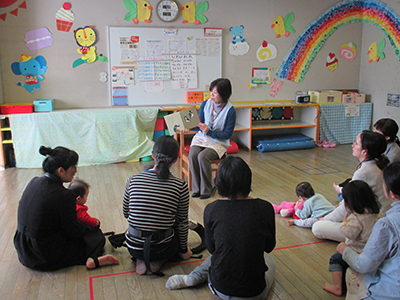 にこちゃんタイム内で行っている「ぴっころさんの読み聞かせ」は、年齢に合わせて手遊びや絵本を読んでくれる、月1回のほっこりタイムです。