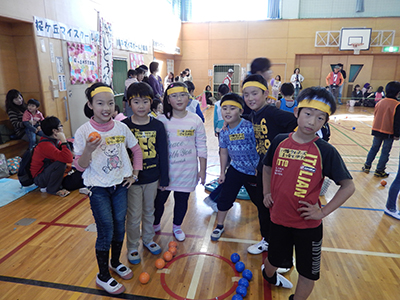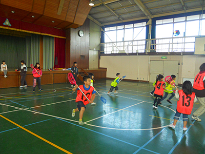 昨年参加した子も、ラクロスというスポーツを初めて見るという子も一緒に、大学生のかっこよくて優しいお姉さんたちから指導を受け、楽しく参加できたようです。クロスというネットの付いたスティックで、ゴムボールを投げたりキャッチしたり。初めて体験した子もちょっとずつコツをつかんで、なかなか様になっていました。最後はミニゲームをしたのですが、かなり白熱した戦いとなり、負けて泣いてしまう子も・・・。それでも最後の感想では、「楽しかった!」「また来年もやりたい!」という声が聞かれ、満足した様子の子どもたちでした。