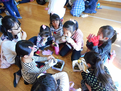 焼きあがった黒く焦げた皮をむくと、中はほくほく。ふうふうしながら食べた焼きいもに参加者一同、大満足の焼きやきパーティーでした。