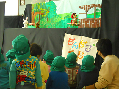 子育て支援クラブ『ポピー』との共催で、「親子で人形劇」の鑑賞会がありました。普段の「ぽっかぽかたいむ」の参加者だけでなく、近隣にある太白保育所の子どもたちや地域の方も一緒に楽しみました。近くにあるやまびこ幼稚園の保護者で立ち上げた人形劇団『どんどこどん』さんの公演は、大きなオオカミが印象的な「赤ずきんちゃん」のお話をはじめ、ハンンドベルや歌などバラエティに富み、月齢の低いお子さんから大人まで楽しめる素晴らしい内容でした。公演後のふれあいタイムでは、直接人形と握手をしたり会話をしたり・・・時間を忘れて人形劇の世界を楽しむ姿が見られました。笑顔いっぱいの子どもたちに、みんな心がぽっかぽかになったようです。