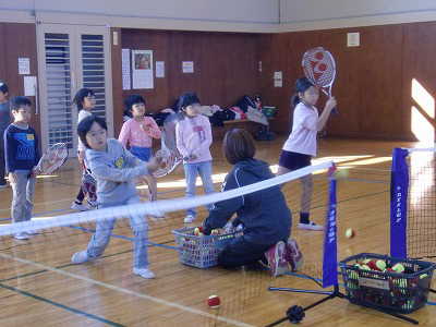 テニススクールの先生方をお呼びして、「テニスにチャレンジ(テニス教室)」を開催しました。将監市民センターの体育館には、将来の『錦織圭選手』をめざし多くの小学生が集まりました。写真は、ネットの前でラケットにボールを当てる動きです。ボールが相手コートに入ると大喜び、みるみる上手になっていき、あっという間に予定の時間が過ぎてしまいました。最後に、お友達へ本物のテニスボールがプレゼントされました。