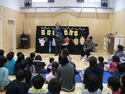 昨年に引き続き、今年も在仙のマジシャン、タティ―さんが、楽しいマジックを披露してくださいました。紙に書いた自己紹介の文字が大きくなるマジックから始まり、なくなったコインが出てきたり、リングをつなげたり、はずしたり等驚きの連続でした。後半は、館長や参加した小学生をステージに呼んで、一緒にマジックをしたり、参加者全員に数字が並んだ紙を配り、それぞれ違った進み方をしても、必ず最後は「8」にたどり着く、という不思議な体験をしました。最後にお楽しみ抽選会も行い、参加した子どもや乳幼児親子は、「とても楽しかった!」と言いながら、嬉しそうに帰っていきました。