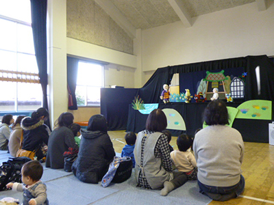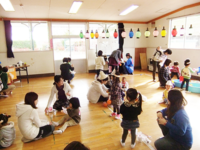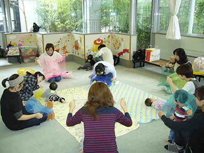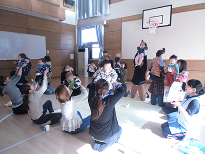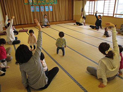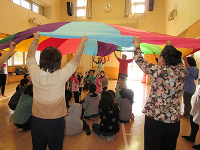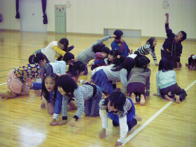 音楽に合わせて体を動かす「ニワトリになってみよう!」の声がけで『私は死にそうなにわとり…』⁇と言って、表情・体を横たえまさにその通り!はじめは戸惑っていた子も、つられたようにいろんな風に体で表現し始め、あっという間に時間が過ぎました。