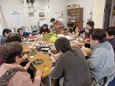 仮設住宅を訪問して、地域の方とのんびりお話をしながら、季節の作りものなどを楽しむ行事です。11月はドングリや花の種などを使ってリースを作りました。皆さんたくさんある中から、思いおもいの材料を選び、オリジナルのリース作りに夢中でした。最後にできあがった作品を前に、お茶を飲みながら楽しい一時を過ごしました。