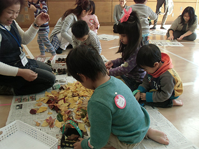 当日は寒さが厳しく遊戯室での活動になりました。木の実や落ち葉を入れるかごを自分で作り(さすが3歳♪)、お気に入りの秋グッズをかごいっぱいに拾いました。
