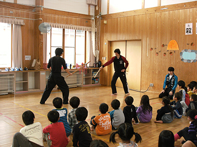 小学生36人がチャンバラに挑戦しました。俳優さんたちの立ち回りに初めは圧倒されましたが、新聞紙で「my刀」を作り、自分たちも気分はサムライとなりました。「殺陣の極意は傷つけずに暴力をふるうこと」の教えを受け、いかに上手に斬ったり、斬られたりを演じるかを少しだけ学ぶことができました。