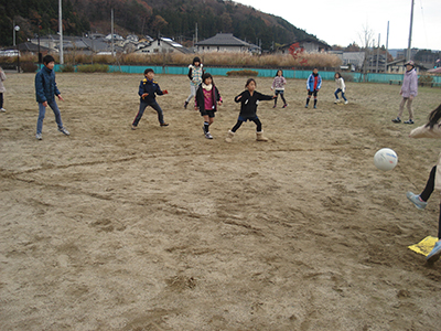 湯元小と馬場小の振替休業日に合わせて実施しました。1年生から6年生まで20人ほどが参加しました。異年齢・男女混成の2チームを作り、低学年でも楽しめるような特別ルールも取り入れました。はじめは、ルールをよく理解できない子もいてモタモタする場面もありましたが、審判や監督(職員)から教えてもらいながら次第にスムーズにゲームが進行できるようになりました。いつもは狭い館庭や遊戯室でややエネルギーを持て余し気味の子供たちも、隣接する広い湯向公園で、歓声をあげながらのびのびと楽しむことができました。この行事を行って以来、児童館では毎日のように遊戯室でキックベースボールを楽しむ子供たちの姿が見られます。