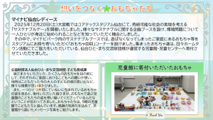 ㅤ表題の件につきまして、2025年12月20日(土)、ユアテックスタジアム仙台でのマイナビ仙台ホームゲームにて、持続可能な社会の実現を考える「サステナブルデー」が開催され、マイナビパークサステナブルブースの「おもちゃ回収コーナー」に多くのおもちゃが集まったことから、マイナビ仙台レディース様より児童館・児童センターへおもちゃのご寄贈をいただきました。
