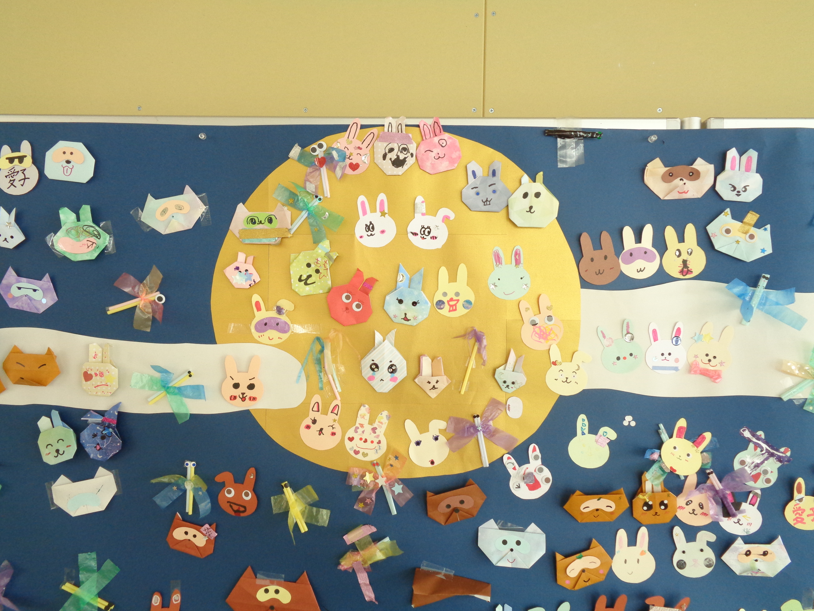 開催期間中、当センターへ来館された皆さまが、ストローとセロファンを使ってとんぼを作ったり、折り紙や型紙を使ってうさぎやたぬきなどを作ったりして、お月見をイメージしたパネルにそれらを飾ってくださいました。