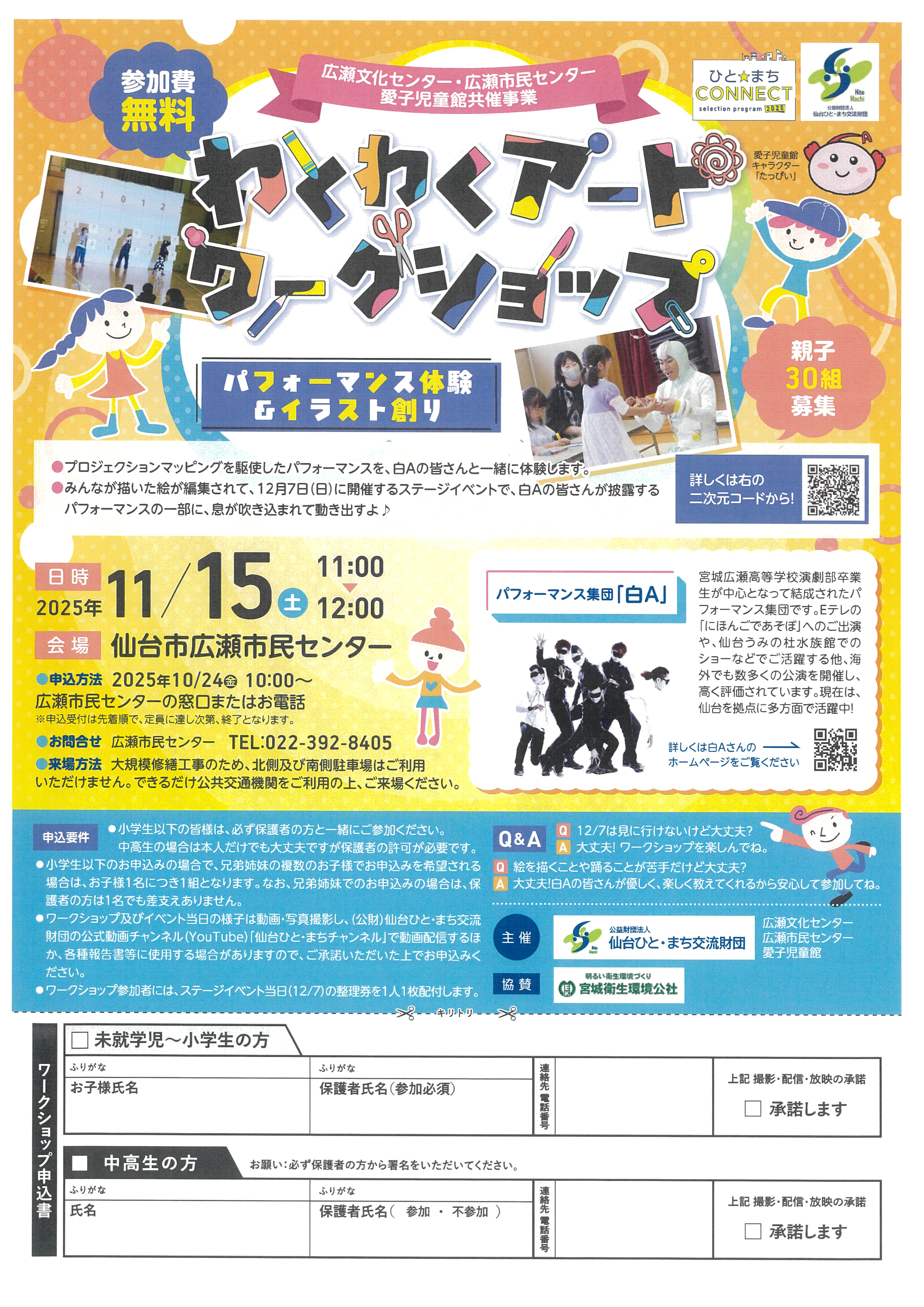 また、ステージイベントの開催に先立ち、白Aの皆様のパフォーマンスに加えるイラストづくりのほか、パフォーマンスを体験できる機会として、広瀬市民センター、愛子児童館との3館共催事業「わくわくアートワークショップ」を、広瀬市民センターを会場に開催します。