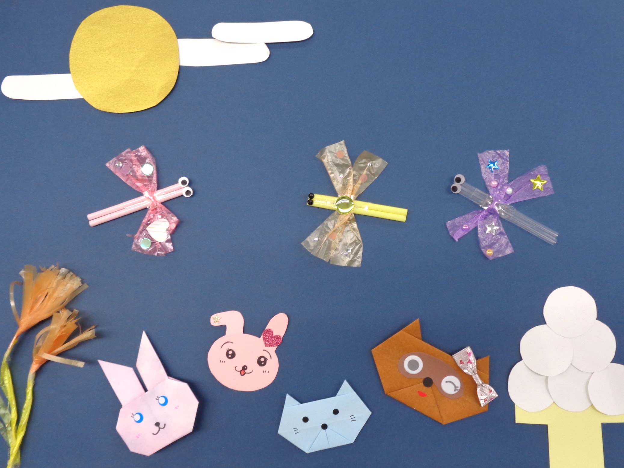 ストローを使って作るとんぼや、折り紙や型紙を使って作るうさぎやたぬきなどを、お月見をイメージしたパネルに飾ることができます。