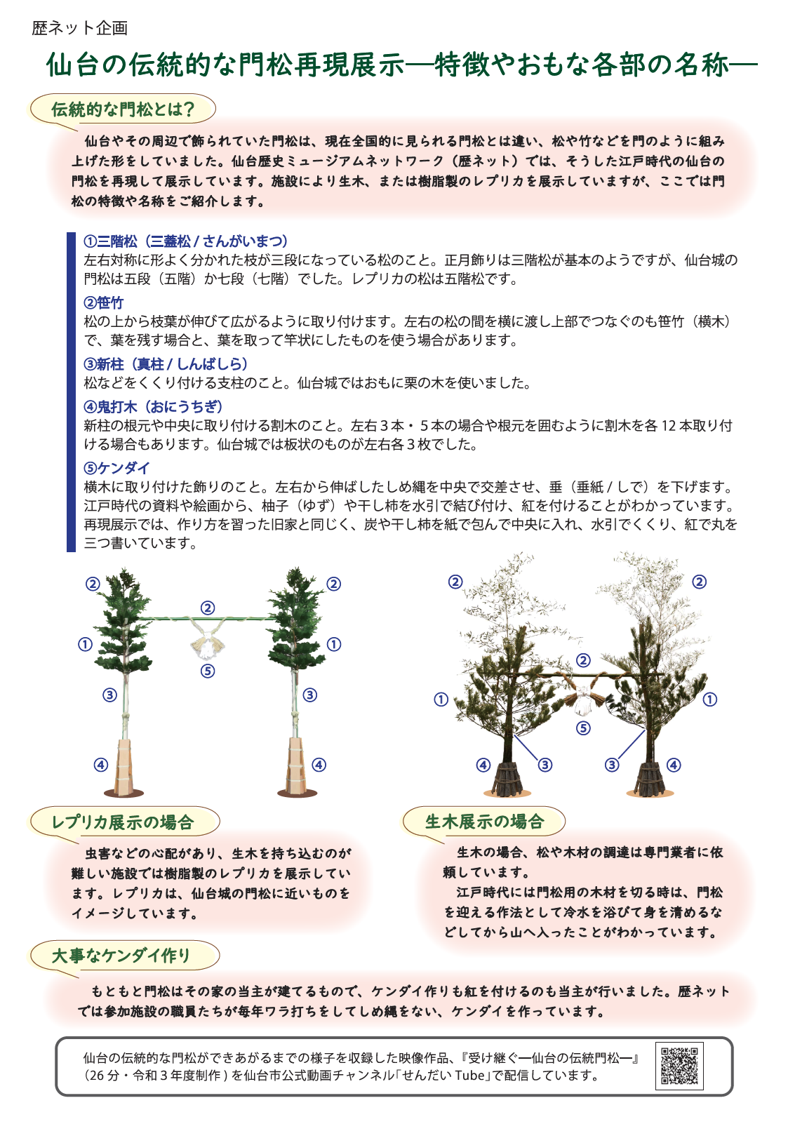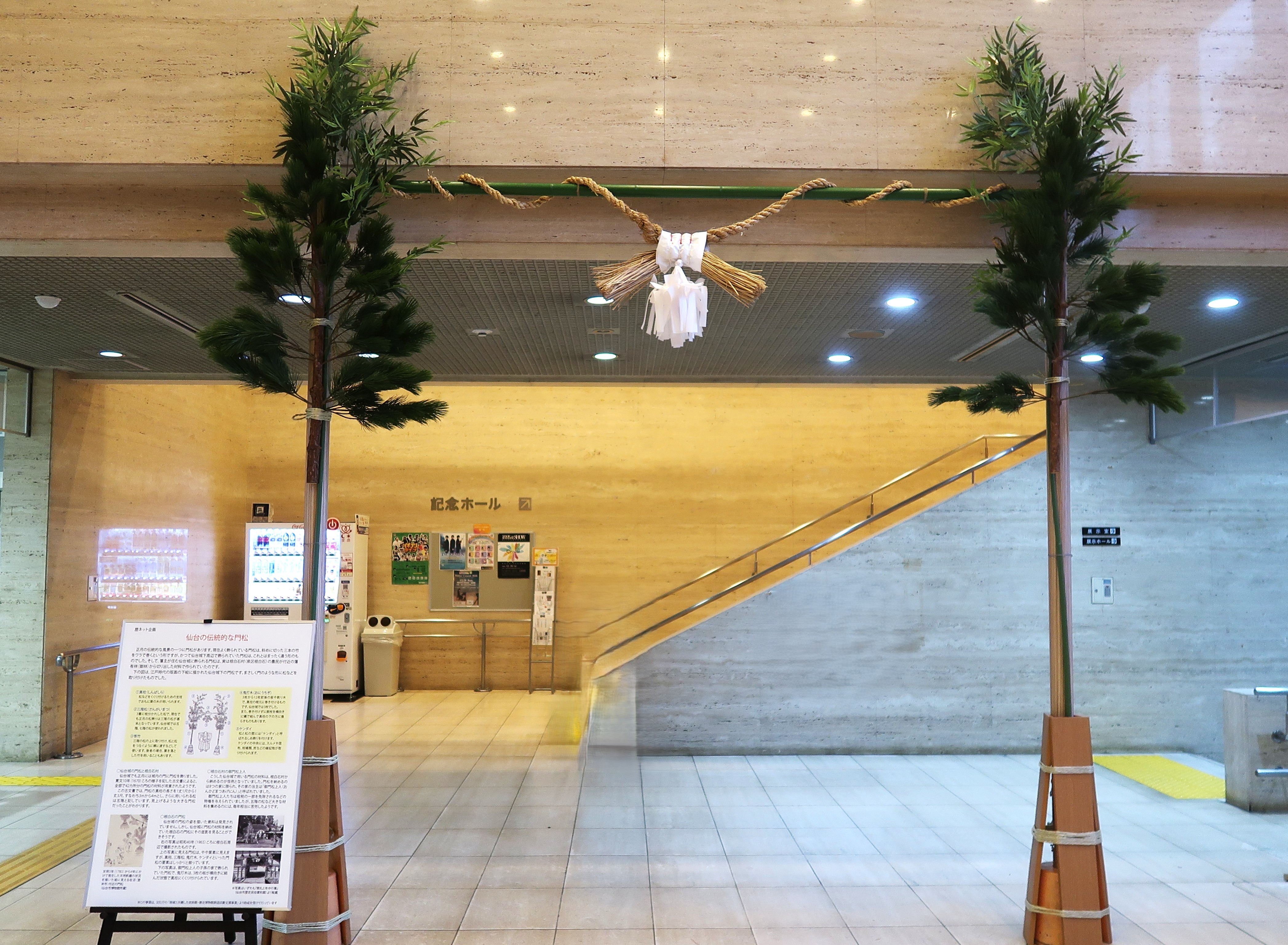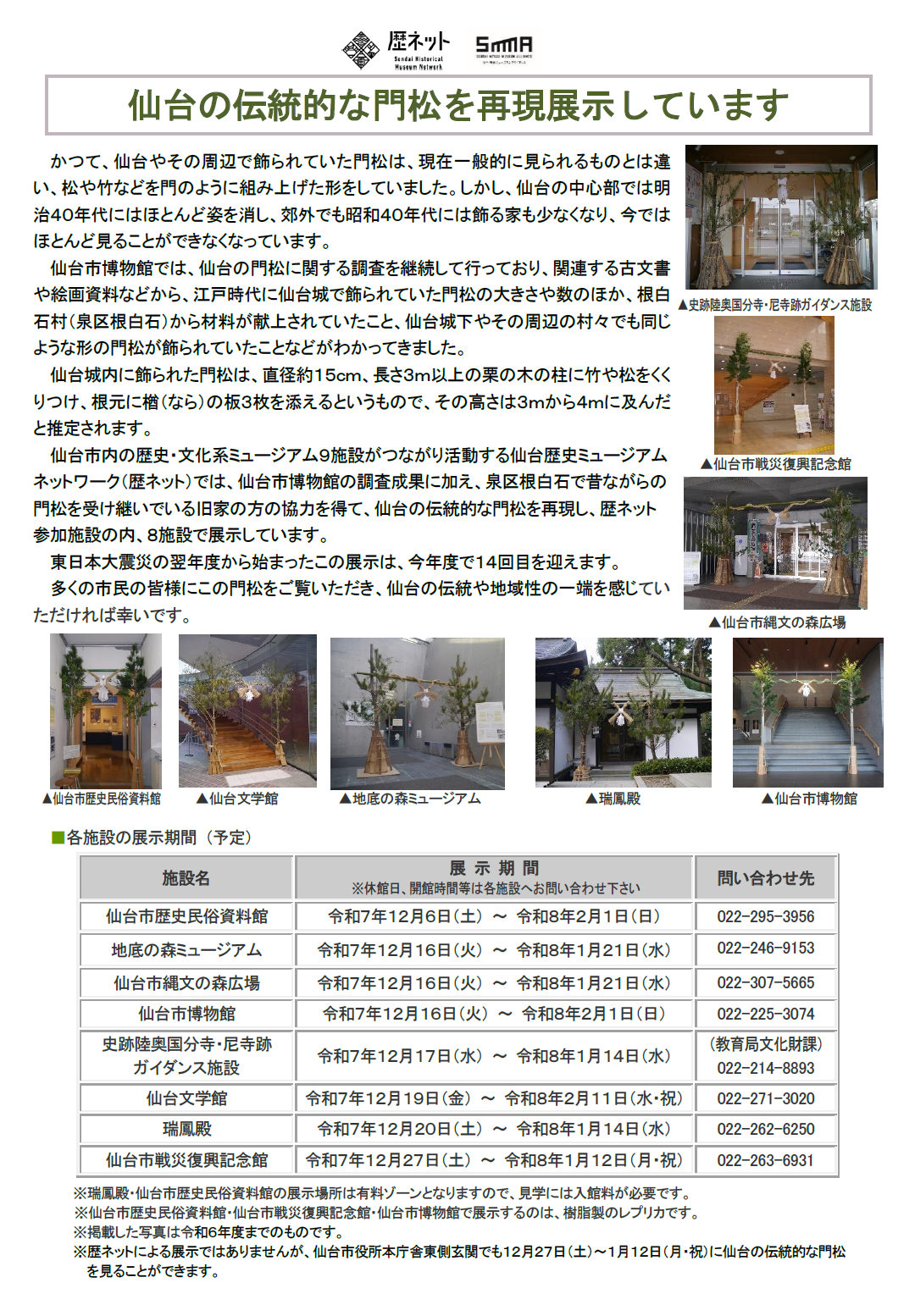 戦災復興記念館では、仙台歴史ミュージアムネットワーク(通称:歴ネット)に参加しており、歴ネットで再現している仙台の伝統的な門松をできるだけ多くの市民の皆様にご覧いただけるよう展示をしております。仙台の伝統や地域性の一端を、この門松から感じ取っていただければ幸いです。