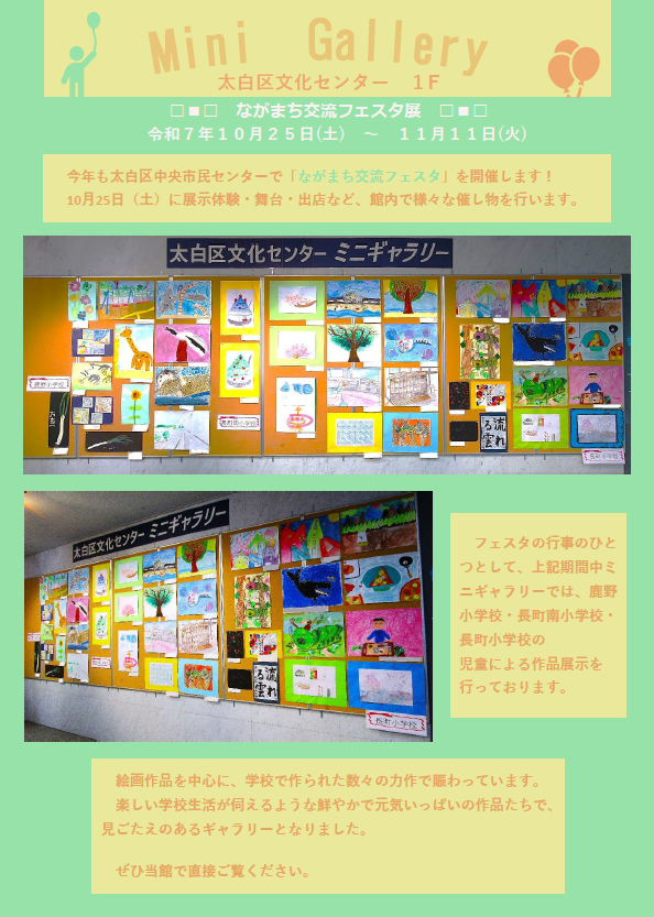 「ながまち交流フェスタ」の展示のひとつとして、児童作品の展示を行っています。