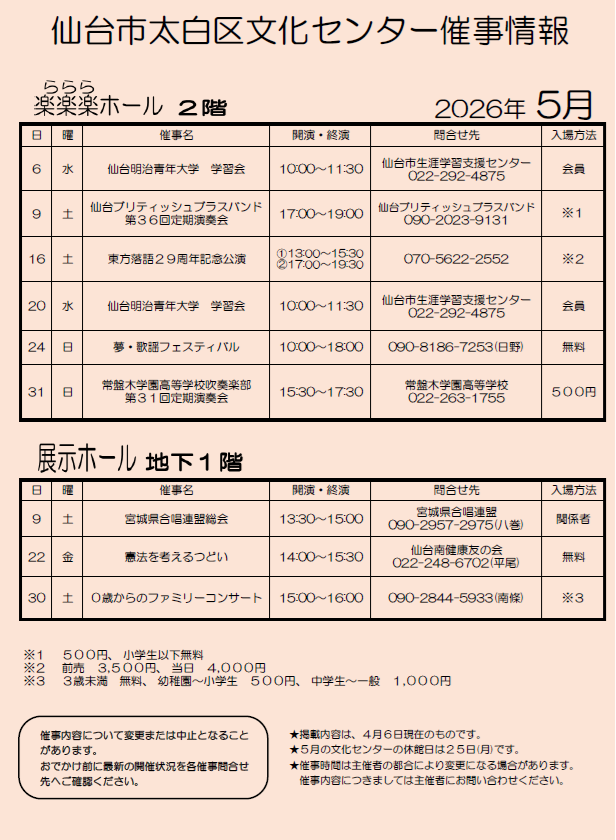 太白区文化センター5月の催事情報(4月6日現在)をお知らせいたします。