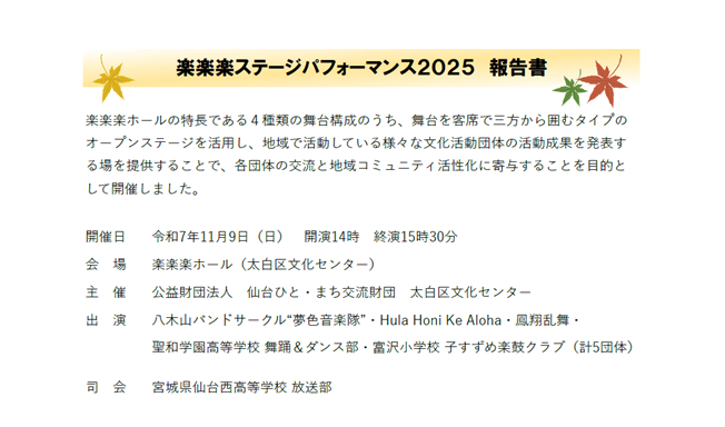 主 催:公益財団法人 仙台ひと・まち交流財団 太白区文化センター
