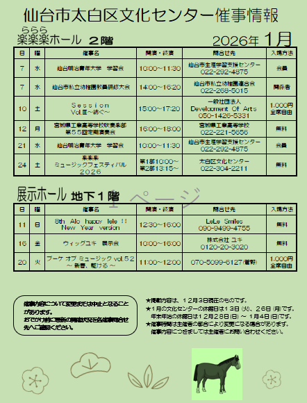 太白区文化センター1月の催事情報(12月3日現在)をお知らせいたします。