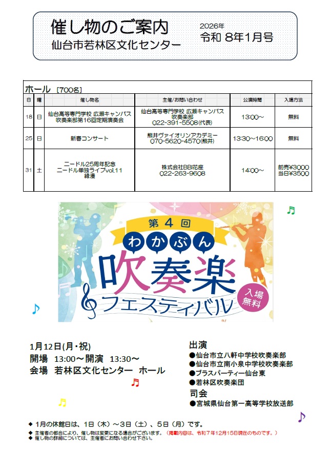 ●出 演 仙台市立八軒中学校吹奏楽部、仙台市立南小泉中学校吹奏楽部、ブラスパーティー仙台東、若林区吹奏楽団(五十音順)